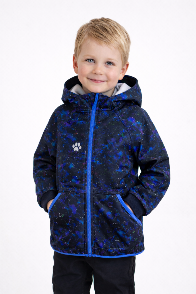 Stylová a funkční dětská softshellová bunda s originálním vzorem vesmíru potěší každého objevitele. :-)