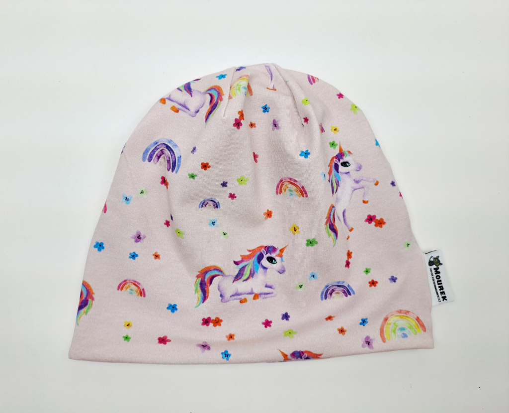 Roztomilá dětská čepice s JEDNOROŽCI a DUHOU na růžovém podkladu. Bavlněná, podšitá a příjemně pružná. Ideální na jaro, podzim i mírnou zimu. Více informací
