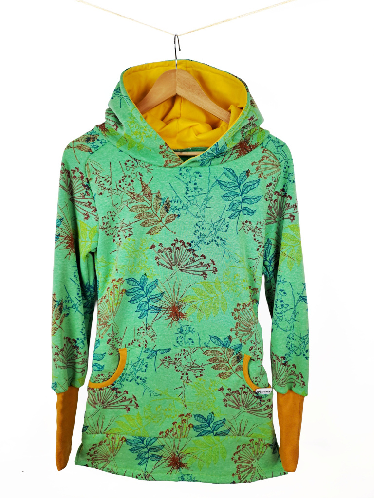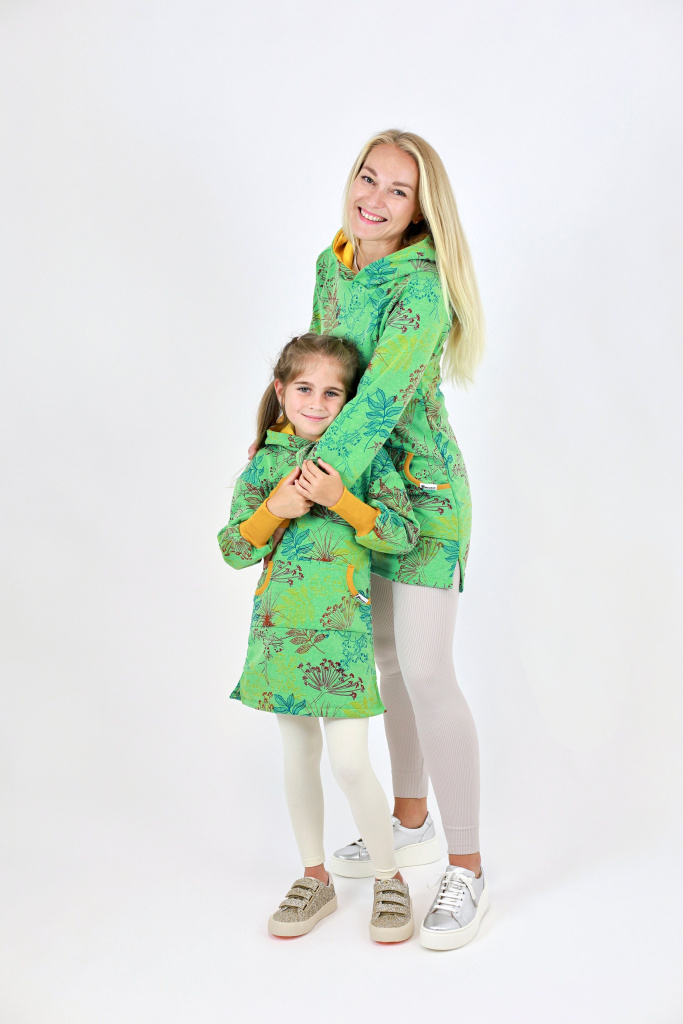 Dámské zelenkavé mikinošaty s kapucí a balónovými rukávy – stylový, pohodlný a hřejivý model na každý den. Dostupné i v dětské verzi pro sladěný mama & dcera outfit. Více informací
