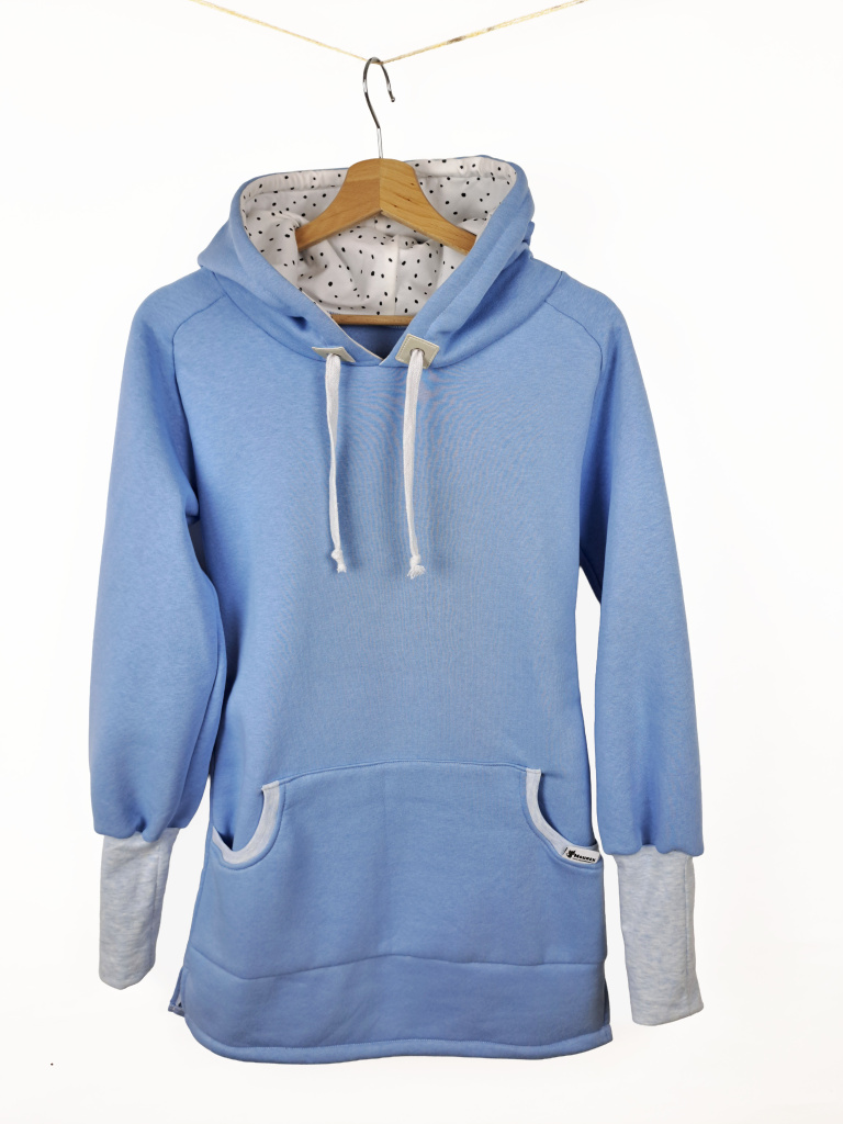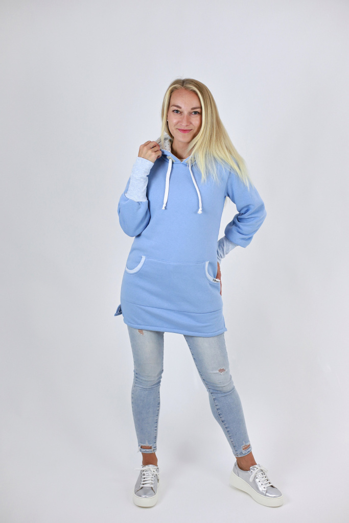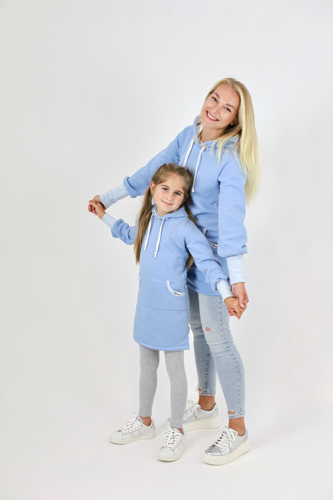 Dámské blankytně modré mikinošaty s kapucí a balónovými rukávy – stylový, pohodlný a hřejivý model na každý den. Dostupné i v dětské verzi pro sladěný mama & dcera outfit. Více informací