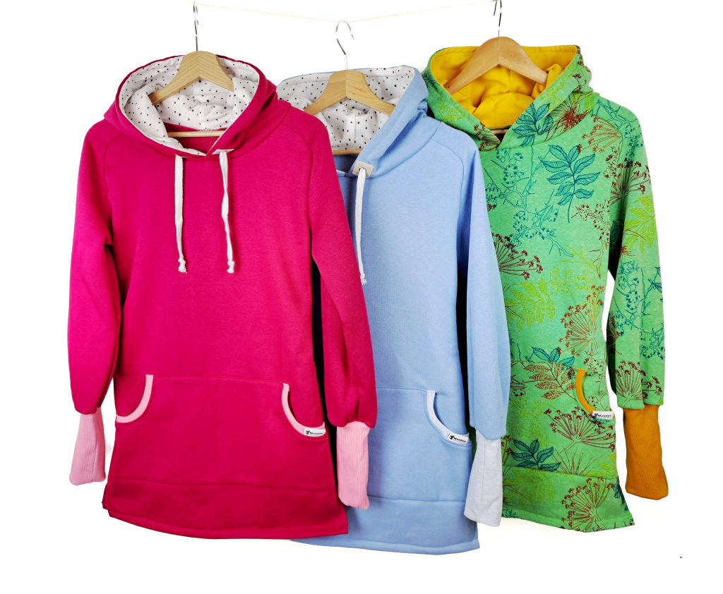 Mikinošaty mají pohodlný rovný střih, výrazné balónové rukávy, praktickou kapuci, ozdobné šňůrky, decentní kožené detaily a prostornou klokaní kapsu. Jsou navrženy tak, aby lichotily postavě a přitom neomezovaly v pohybu.