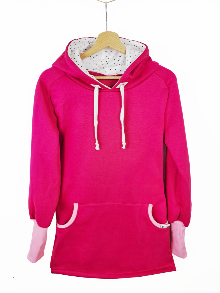 Dámské růžové mikinošaty s kapucí a balónovými rukávy – stylový, pohodlný a hřejivý model na každý den. Dostupné i v dětské verzi pro sladěný mama & dcera outfit. Více informací