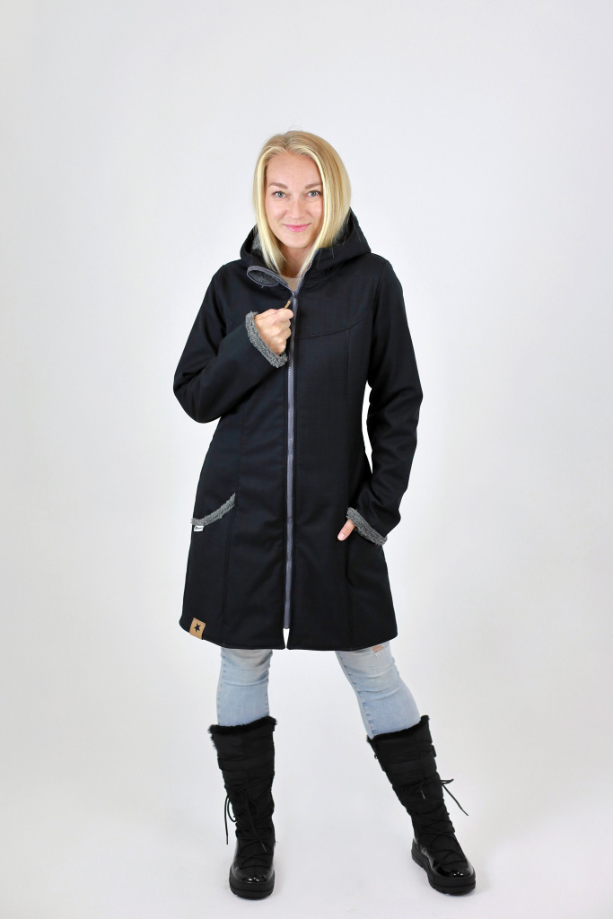 Jedná se o princes střih, tzn. projmutý v pase. V zadní části sedla kabátu je záševek, který umožňuje volný pohyb a možnost pod kabát vrstvit oblečení.