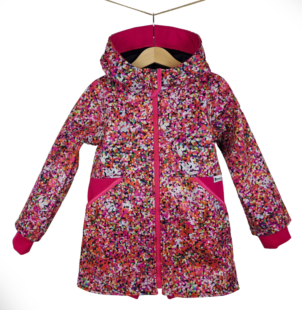 Stylová dívčí softshellová parka s fleecem. Nepromokavá, větruodolná a prodyšná – ideální na jaro, podzim i mírnou zimu. Krásný design růžových konfet a praktické detaily jako skryté manžety. Snadná údržba, rychleschnoucí materiál. Více informací