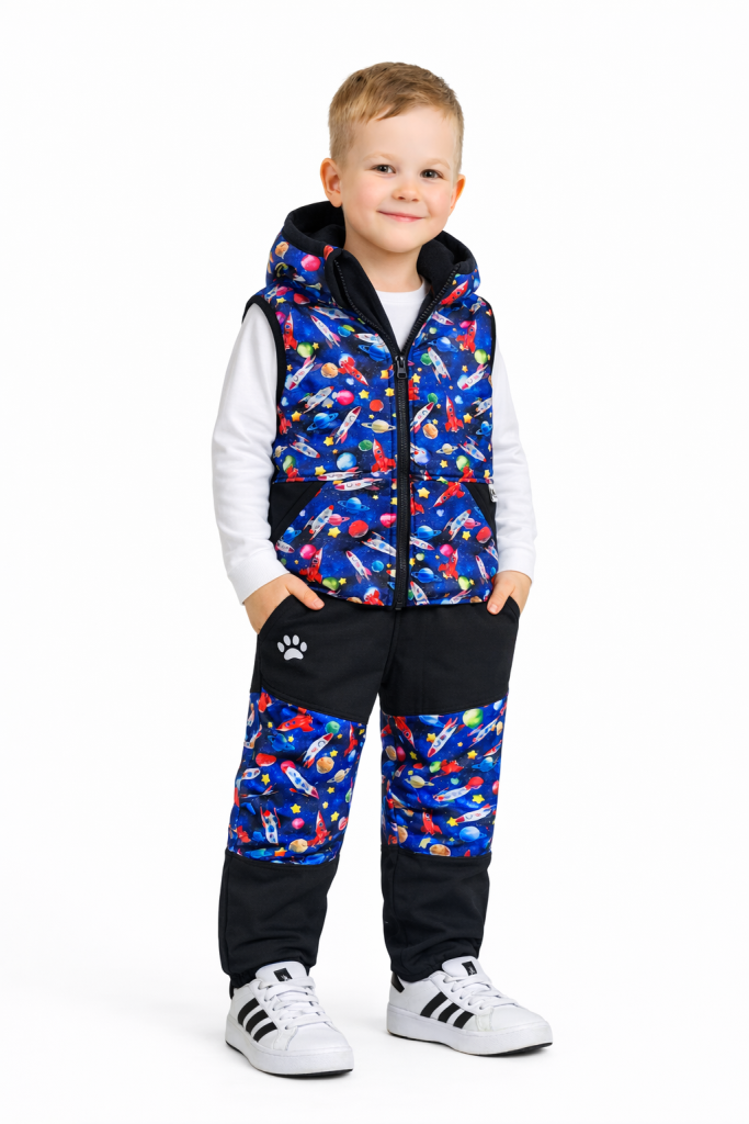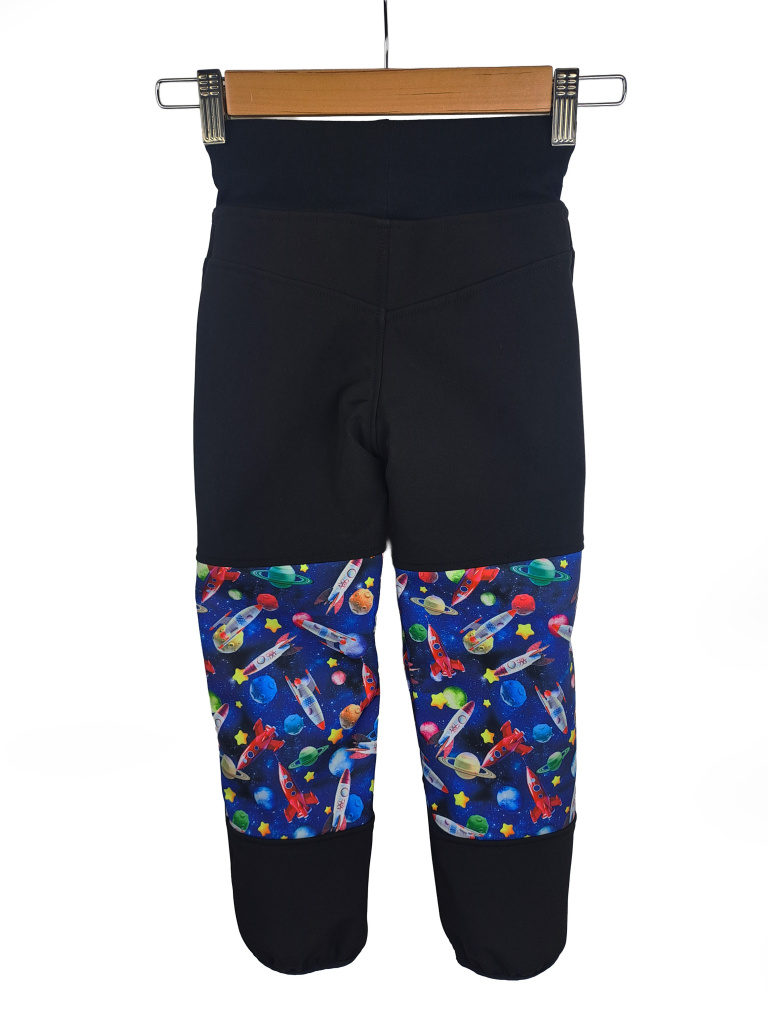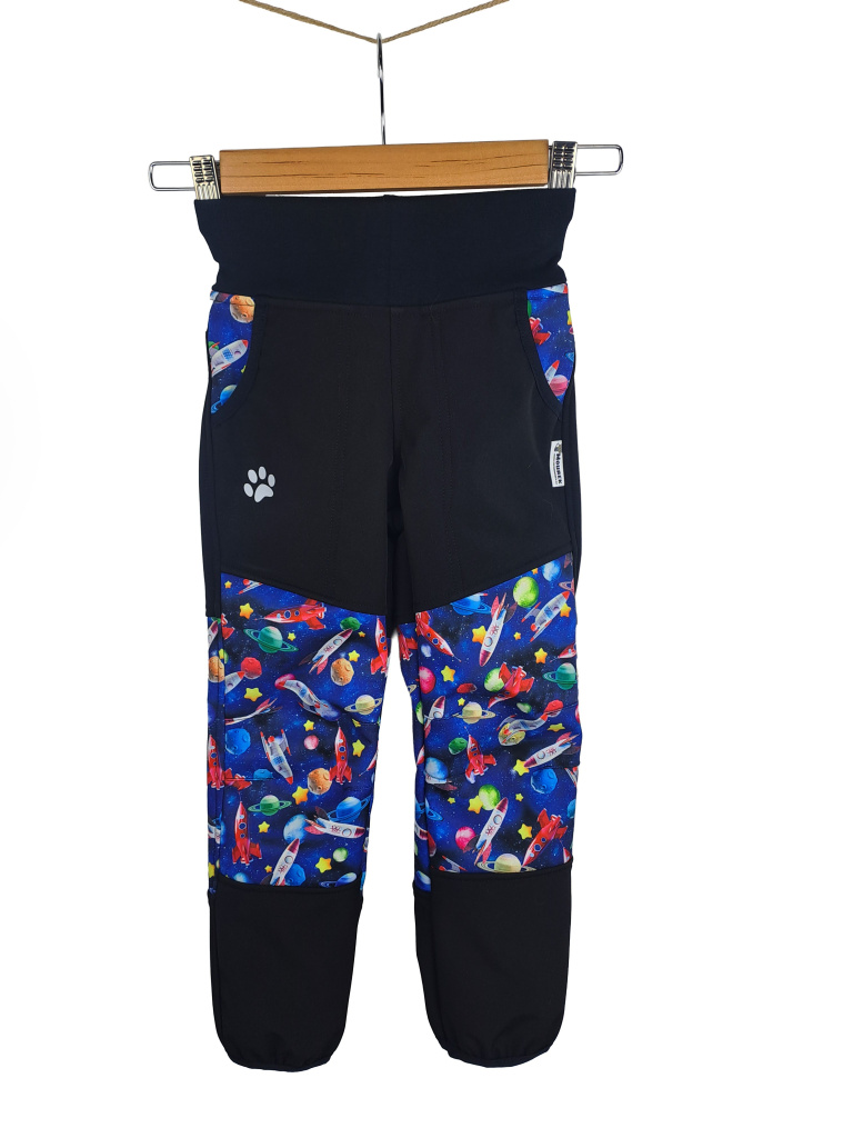 Dětské softshellové kalhoty s fleecem v designu RAKETY jsou pohodlné, nepromokavé a větruodolné. Lehce užší střih se záševky na kolenou umožňuje volný pohyb a pruženka na nohavicích zajistí, že kalhoty nepadají přes boty. Více informací