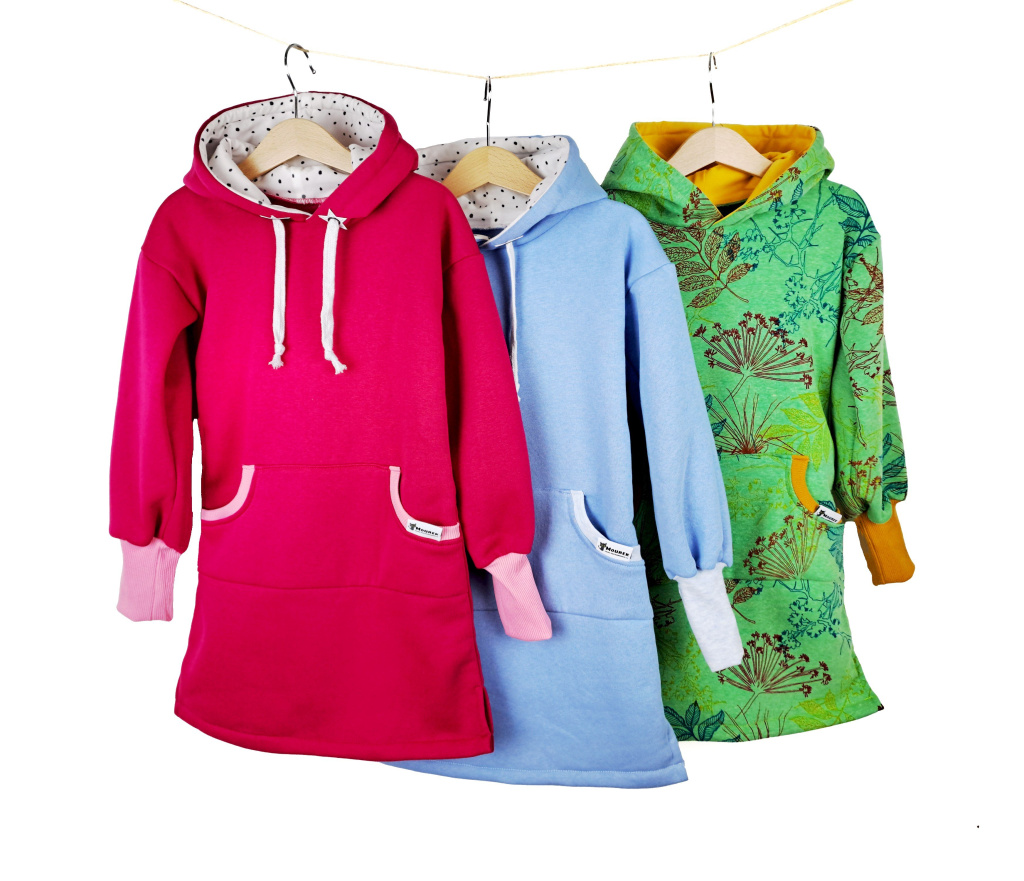 Díky balónovým rukávům mají šaty jemně elegantní vzhled, ale zároveň zůstávají velmi pohodlné. Kapuce, stylové šňůrky, kožené detaily a praktická klokaní kapsa dodávají šatům šmrnc. Tento model si zamiluje každá malá slečna!