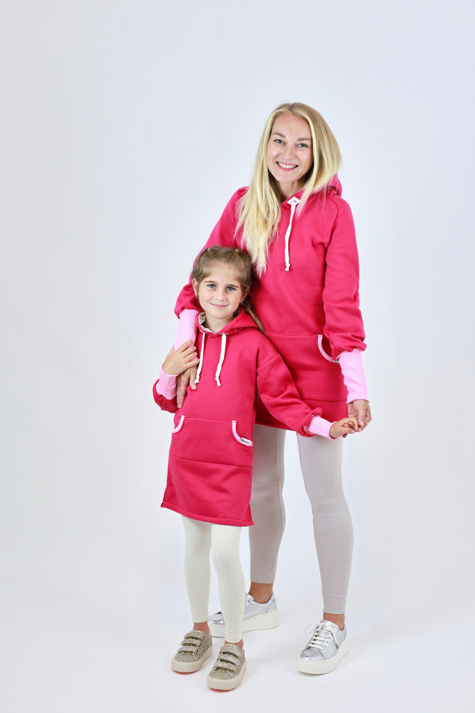 A co je na tom nejlepší? Stejné mikinošaty nabízíme i ve velikostech pro maminky! Můžete tak vytvořit dokonalý máma & dcera outfit ve stejné růžové barvě – stylové a sladěné oblečení, které si zamilujete obě.