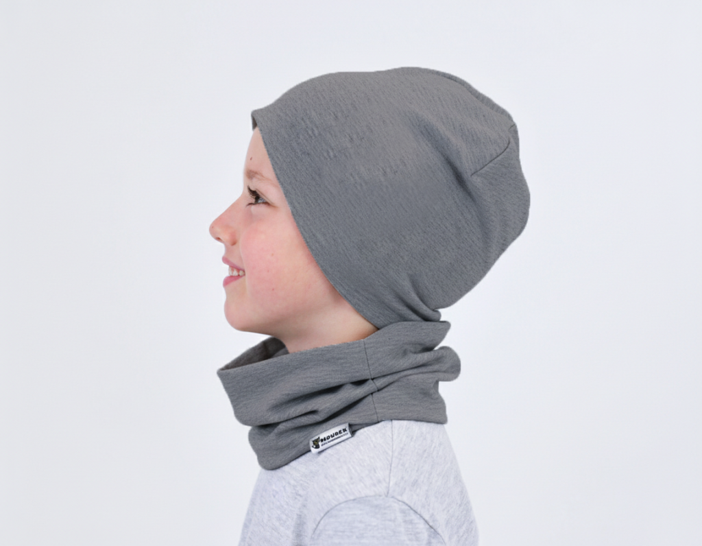 Krásný dětský SET čepice s nákrčníkem v designu jednobarevného melíru. Bavlněný, podšitý a příjemně pružný. Ideální na jaro, podzim i mírnou zimu. Více informací