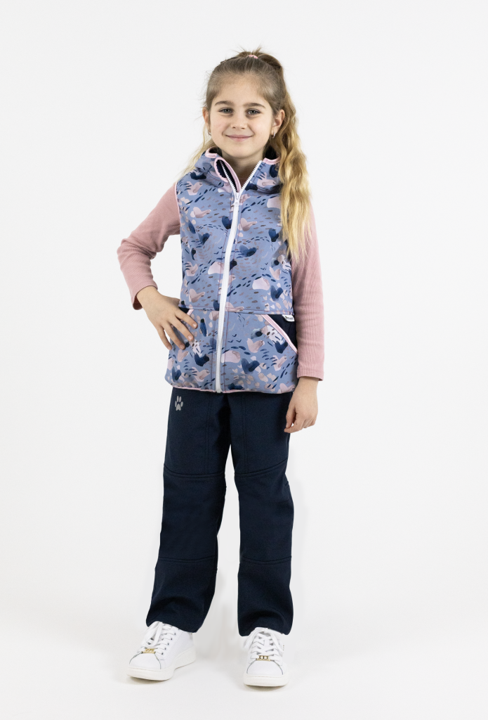 Vesta je ušita z krásného designového zimního softshellu, takže krásně hřeje, děti se v ní nepotí. Mají volnost v pohybu, nikde nic netlačí nikde nic nepřekáží.